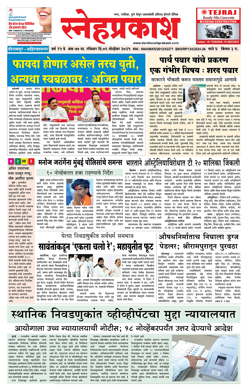 Daily Snehprakash (Marathi) November 09, 2025 Ahilyanagar-Pune-Nashik-shrirampur maharashtra 1 2 3 4 Page 1Page 2Page 3Page 4 × Daily Snehprakash (Marathi) 1-4 colour1-4 colour21-4 colour31-4 colour4 << First << 1 >> Last >> Page no 1Page no 2Page no 3Page no 4