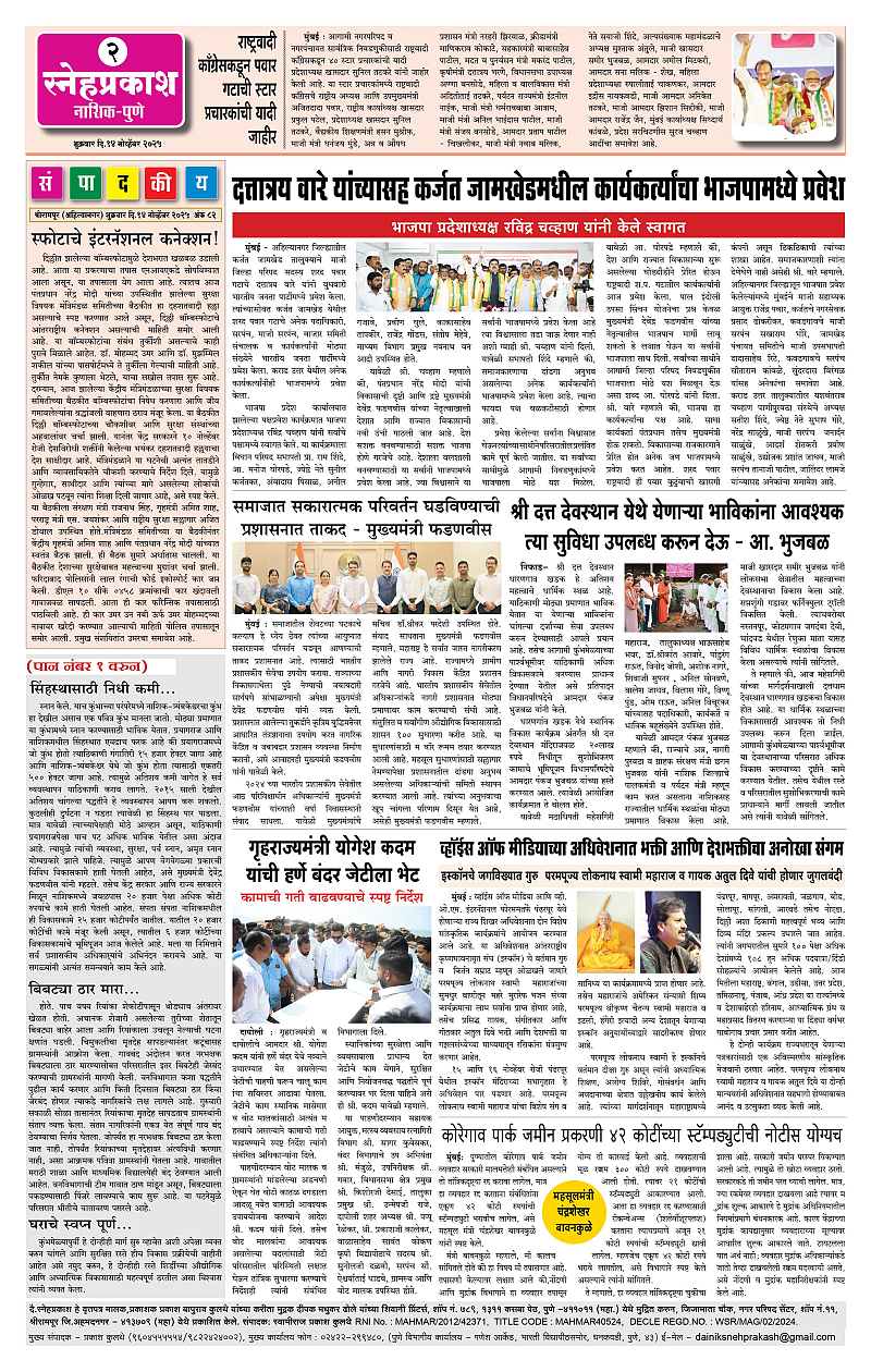 Daily Snehprakash (Marathi) Page: 2 November 14, 2025 Ahilyanagar-Pune-Nashik-shrirampur maharashtra 1 2 3 4 Page 1Page 2Page 3Page 4 × Daily Snehprakash (Marathi) 1-41-421-431-44 << First << 2 >> Last >> Page no 1Page no 2Page no 3Page no 4