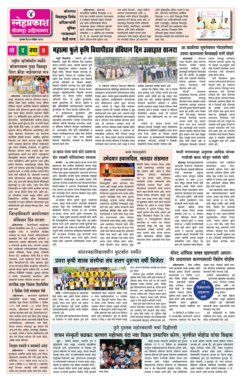 Daily Snehprakash (Marathi) Page: 4 November 27, 2025 Ahilyanagar-Pune-Nashik-shrirampur maharashtra 1 2 3 4 Page 1Page 2Page 3Page 4 × Daily Snehprakash (Marathi) 1-41-421-431-44 << First << 4 >> Last >> Page no 1Page no 2Page no 3Page no 4