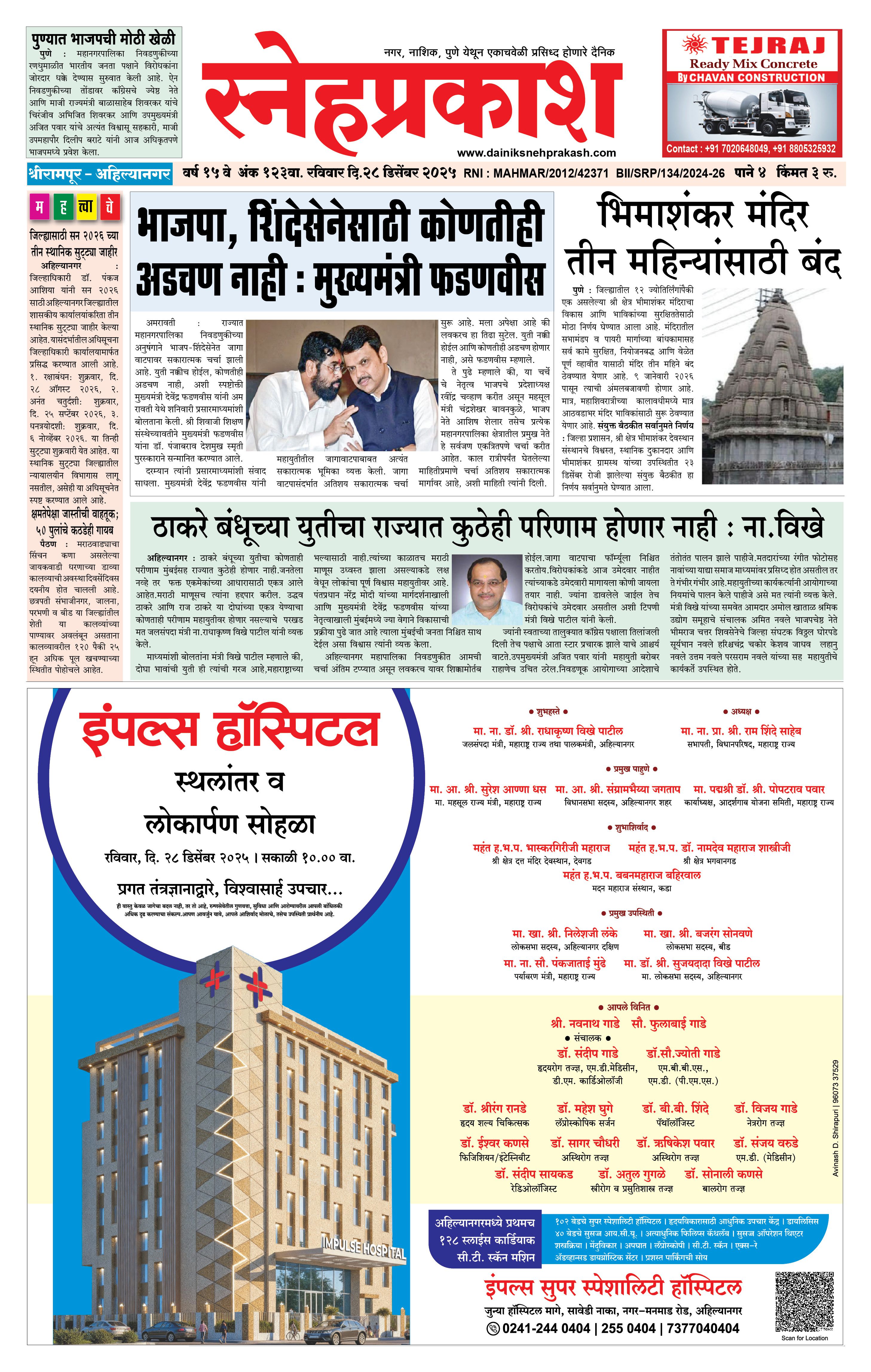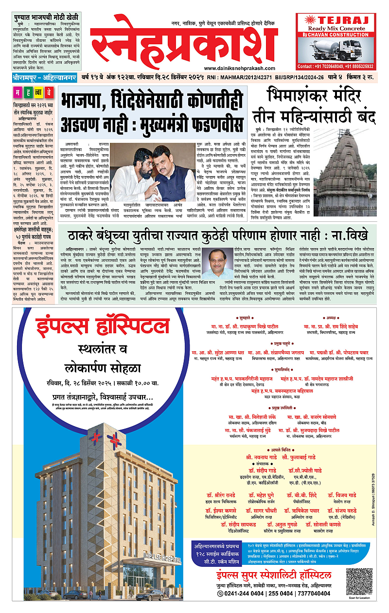 Daily Snehprakash (Marathi) December 28, 2025 Ahilyanagar-Pune-Nashik-shrirampur maharashtra 1 2 3 4 Page 1Page 2Page 3Page 4 × Daily Snehprakash (Marathi) 1-41-421-431-44 << First << 1 >> Last >> Page no 1Page no 2Page no 3Page no 4
