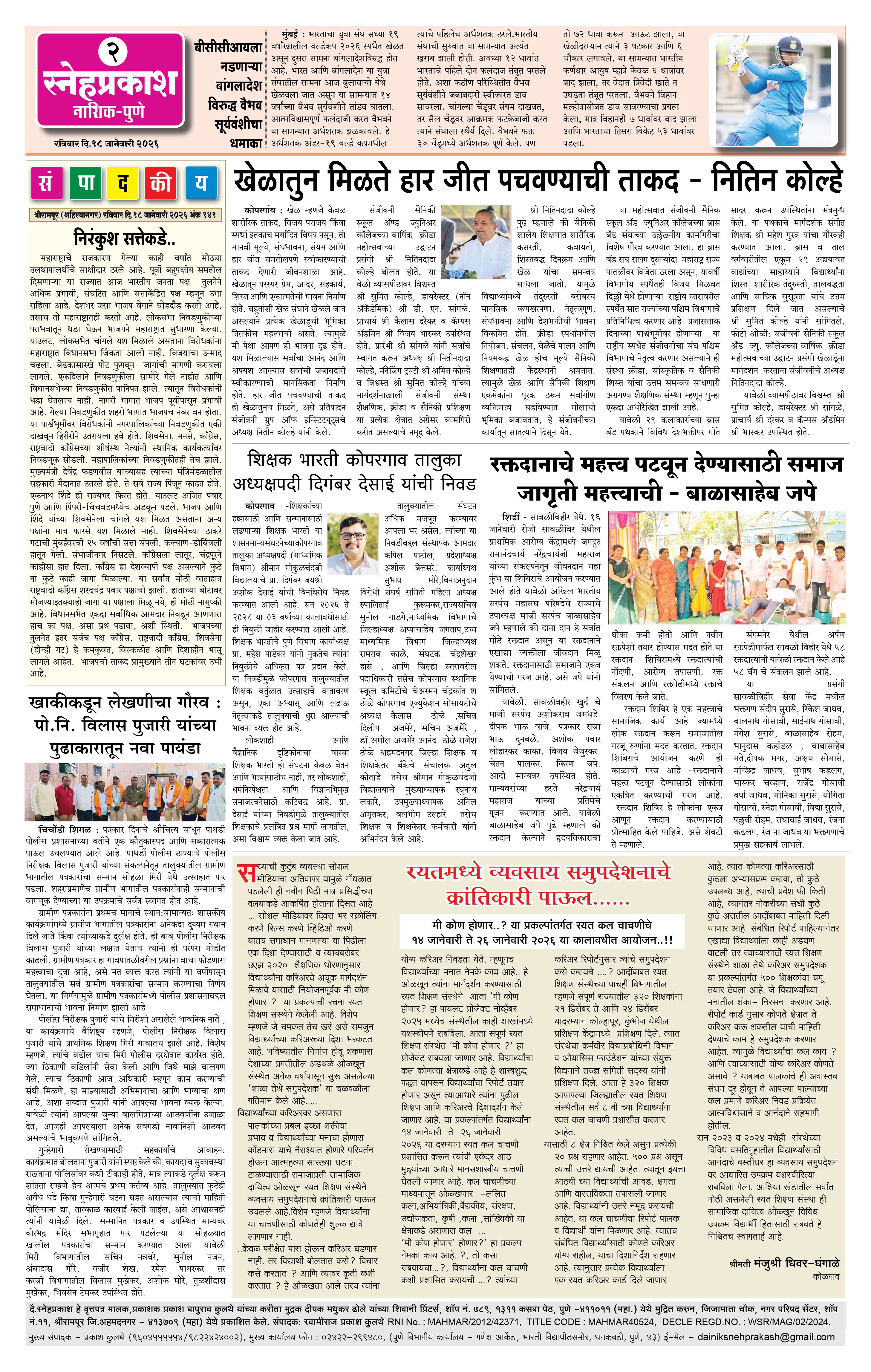 Daily Snehprakash (Marathi) Page: 2 January 18, 2026 Ahilyanagar-Pune-Nashik-shrirampur maharashtra 1 2 3 4 Page 1Page 2Page 3Page 4 × Daily Snehprakash (Marathi) 1-41-421-431-44 << First << 2 >> Last >> Page no 1Page no 2Page no 3Page no 4