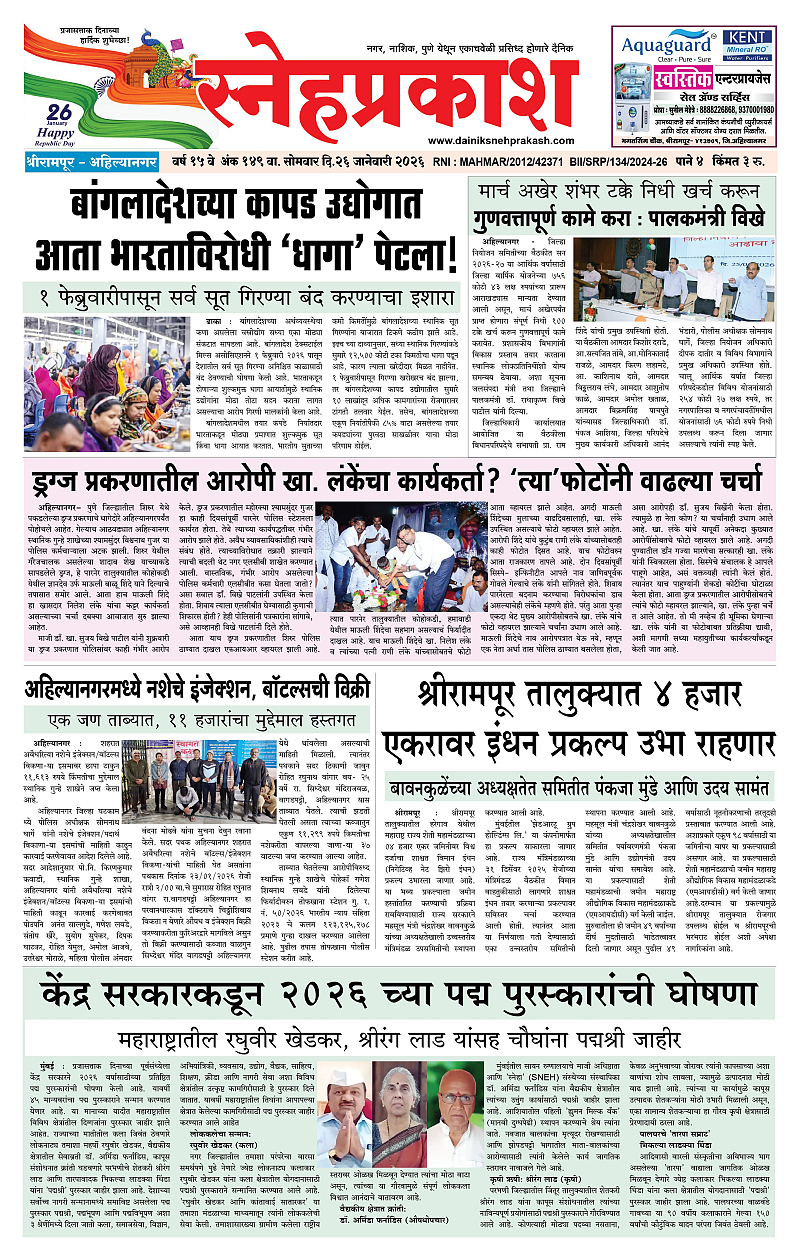 Daily Snehprakash (Marathi) January 26, 2026 Ahilyanagar-maharashtra 1 2 3 4 Page 1Page 2Page 3Page 4 × Daily Snehprakash (Marathi) 1 Snehprakash New1-4 Snehprakash21-4 Snehprakash31-4 Snehprakash4 << First << 1 >> Last >> Page no 1Page no 2Page no 3Page no 4