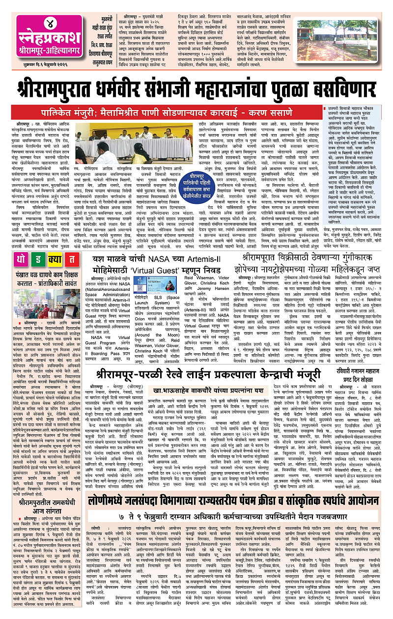 Daily Snehprakash (Marathi) Page: 4 February 06, 2026 Ahilyanagar-Pune-Nashik-shrirampur maharashtra 1 2 3 4 Page 1Page 2Page 3Page 4 × Daily Snehprakash (Marathi) 12-422-432-44 << First << 4 >> Last >> Page no 1Page no 2Page no 3Page no 4