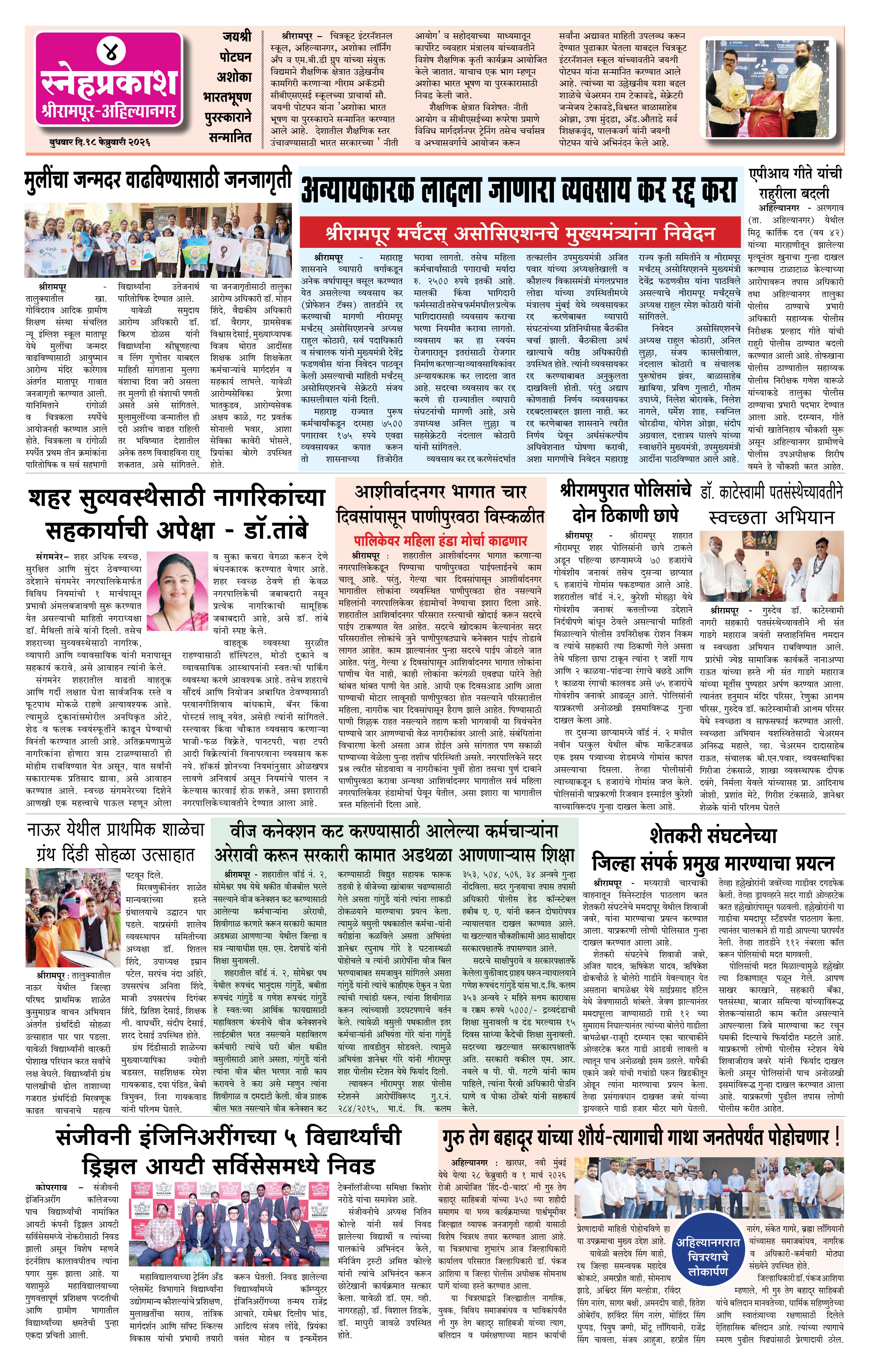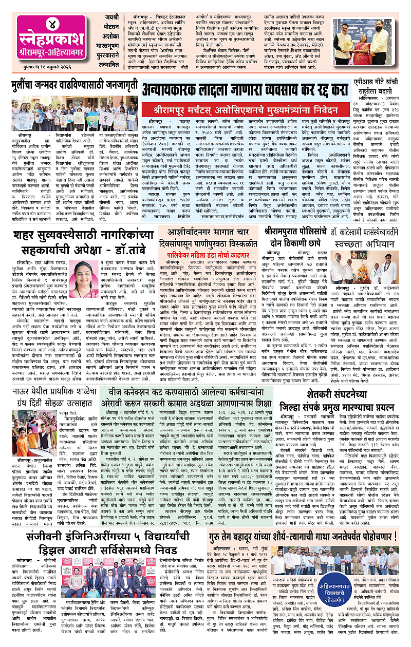 Daily Snehprakash (Marathi) Page: 4 February 18, 2026 Ahilyanagar-Pune-Nashik-shrirampur maharashtra 1 2 3 4 Page 1Page 2Page 3Page 4 × Daily Snehprakash (Marathi) 1111213 << First << 4 >> Last >> Page no 1Page no 2Page no 3Page no 4