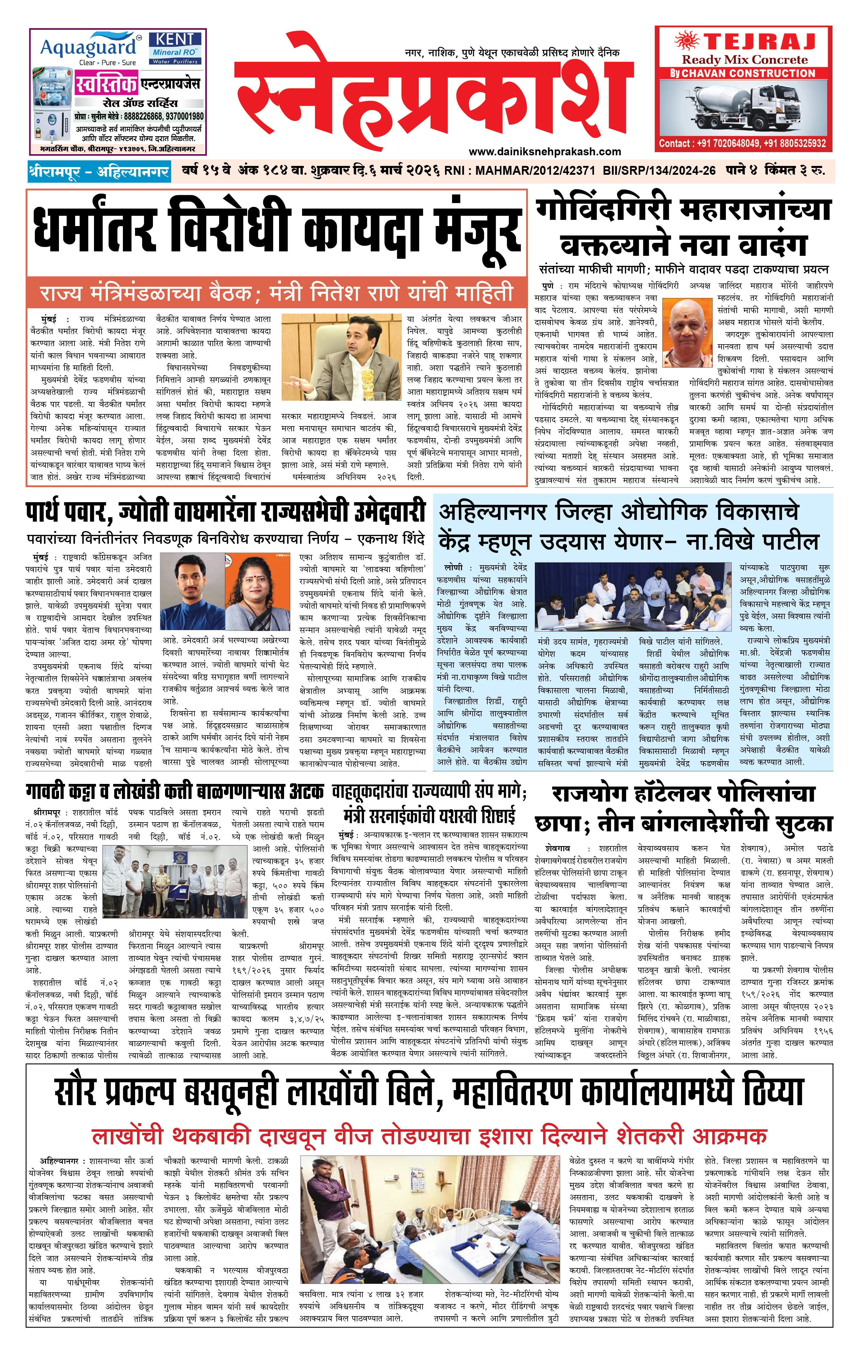 Daily Snehprakash (Marathi) March 06, 2026 Ahilyanagar-Pune-Nashik-shrirampur maharashtra 1 2 3 4 Page 1Page 2Page 3Page 4 × Daily Snehprakash (Marathi) 1-41-421-431-44 << First << 1 >> Last >> Page no 1Page no 2Page no 3Page no 4