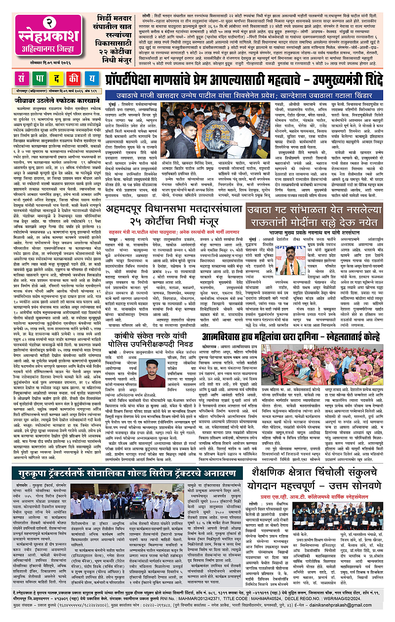 Daily Snehprakash (Marathi) Page: 2 March 09, 2026 Ahilyanagar-Pune-Nashik-shrirampur maharashtra 1 2 3 4 Page 1Page 2Page 3Page 4 × Daily Snehprakash (Marathi) 1-41-421-431-44 << First << 2 >> Last >> Page no 1Page no 2Page no 3Page no 4