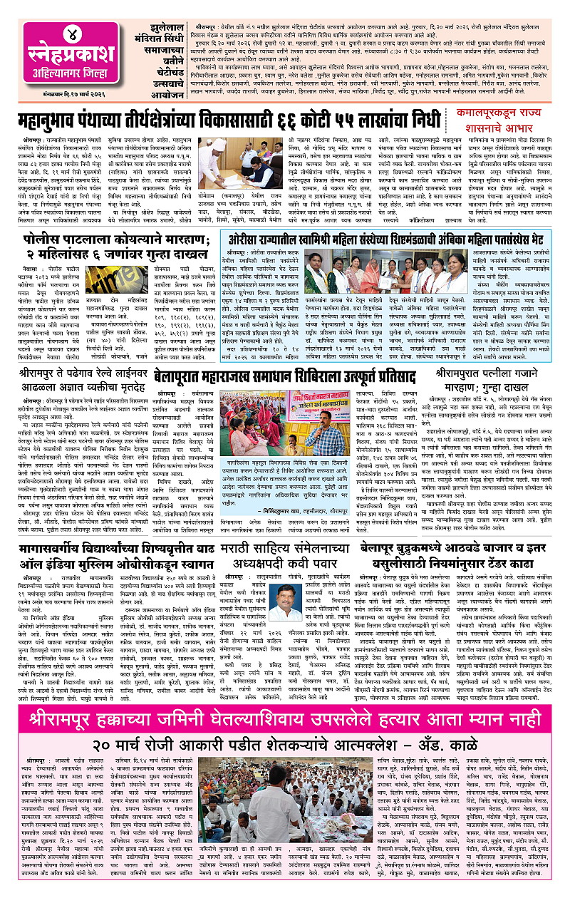 Daily Snehprakash (Marathi) Page: 4 March 17, 2026 Ahilyanagar-Pune-Nashik-shrirampur maharashtra 1 2 3 4 Page 1Page 2Page 3Page 4 × Daily Snehprakash (Marathi) 12-32-324 << First << 4 >> Last >> Page no 1Page no 2Page no 3Page no 4